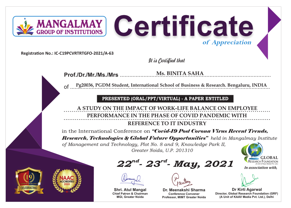 In this 7 tracks International Conference(Plenary sessions) ISBR students presented 3 tracks of research papers. We feel proud to share that  in a total of 123 papers, we got the best paper award for our paper titled “A Study on the Impact of Work-Life Balance on Employee Performance in the Phase of Covid Pandemic with reference to IT industry” by
