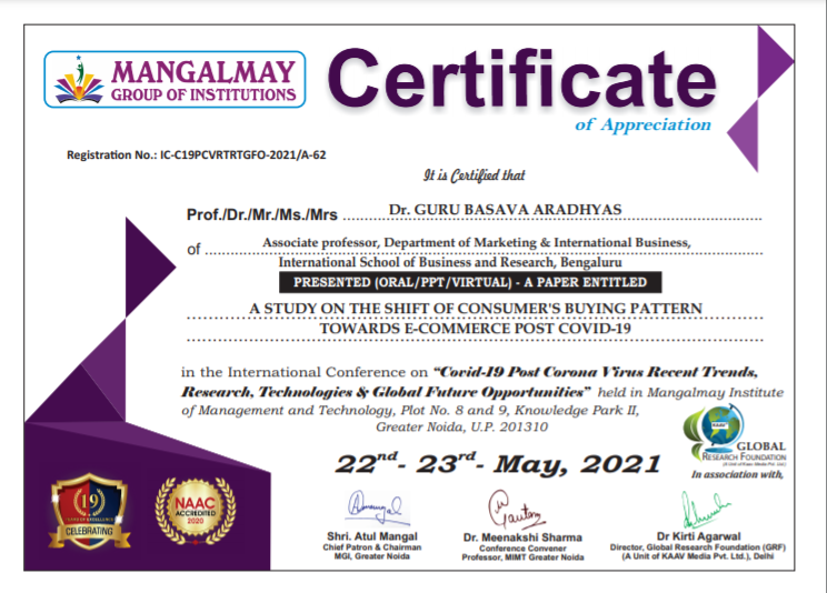 ii. A study on the shift of consumer’s buying pattern towards E-commerce post-covid-19 by Dr. Guru Basava Aradhya, Ms. Khushboo, and Ms. Sampada organized by Mangalmay Institute of Management, Greater Noida, UP on 22 nd & 23 rd May 2021 Dr. Guru Basava Aradhya and 3 rd Trimester PGDM Students thank the Director and Management of