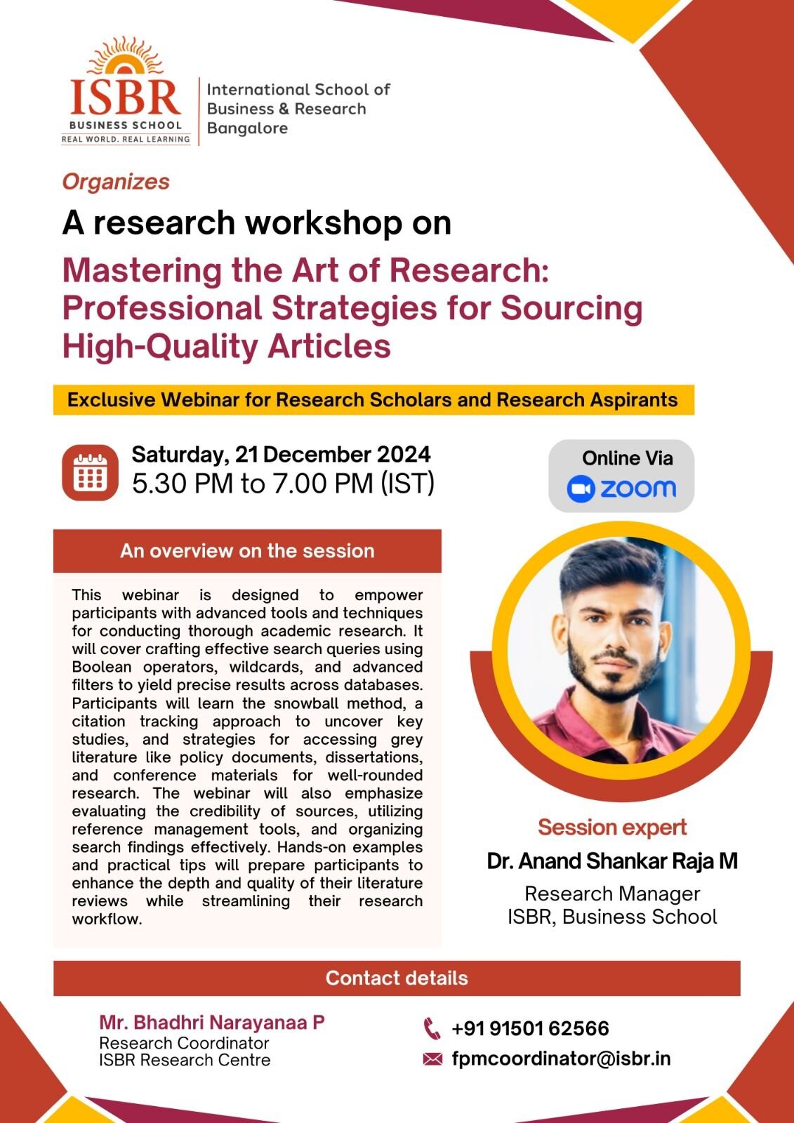 ISBR Business School hosted an enlightening webinar titled “Mastering the Art of Research: Professional Strategies for Sourcing High-Quality Articles.” This event aimed to equip research scholars and aspirants with advanced methodologies for sourcing credible academic articles, enhancing the quality and depth of their research endeavors.