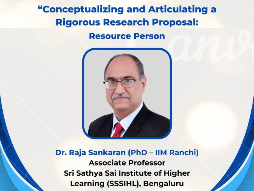 The masterclass was led by Dr. Raja Sankaran (PhD – IIM Ranchi), Associate Professor at Sri Sathya Sai Institute of Higher Learning (SSSIHL), Bengaluru. Known for his academic mentorship and specialization in research methodology, Dr. Sankaran delivered an engaging and enriching session full of practical advice, live examples, and best practices tailored for doctoral researchers.