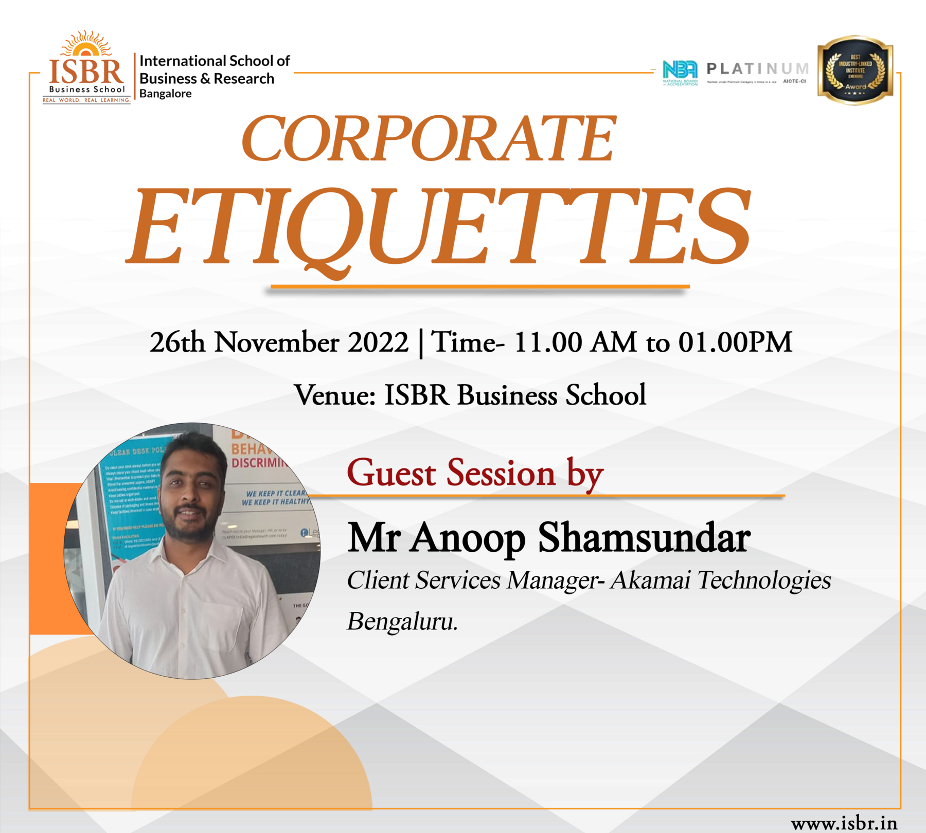 In this talk, Mr. Anoop addresses the concept of corporate etiquette. It refers to how an individual should behave while at work. Each one needs to maintain the decorum of the organization. It consists of a set of rules an individual must follow while at work. It conveys how an individual must behave sensibly and appropriately at the workplace to create an everlasting impression.