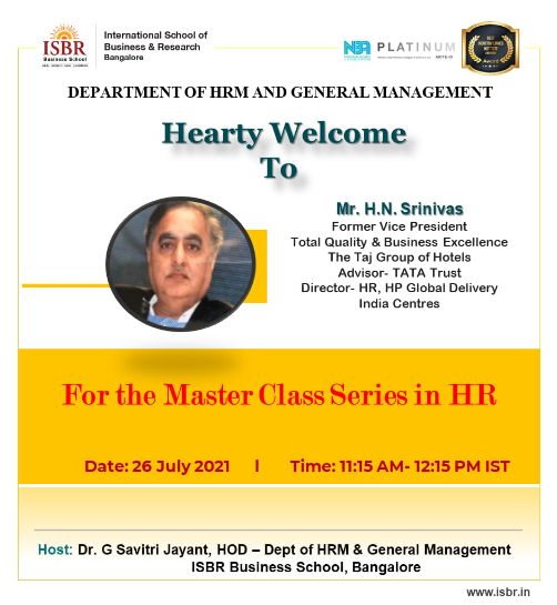 Mr. H. N. Srinivas, worked with THE TAJ GROUP OF HOTELS for 25+ years growing up to Sr. Vice President –Total Quality and Business Excellence (Corporate Quality Head) and Sr. Vice President –Human Resources. People practice function at Taj successfully built a customer centric work culture through innovative employee engagement practices. This was acknowledged by Gallup Incorporated, US, by listing Taj among the top 15 companies in the world; was the recipient of Global Great Workplace Award for 4 consecutive years. This journey of building benchmark HR practices at Taj has become a Harvard case study. Taj hotels were also recognized with Tata Business Excellence Award (based on Malcolm Baldridge National Quality Award) for achievement of highest standards of service quality, employee engagement and customer excellence. Also lead the relief and rehabilitation operation for terror victim families in the city of Mumbai post 26/11 terror attack. Worked with HP-Global Delivery India Centre as Director –Human Resources for 3 years managing end-to-end HR for a workforce of about 10,000 employees mostly software engineers. Worked as Advisor Tata Sons on a major Skill Development project that was conceptualized by the then Chairman, to support and
