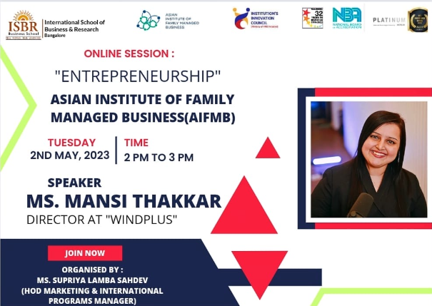 The Asian Institute of Family Managed Business (AIFMB) and Bangalore’s International School of Business & Research (ISBR) collaborated to host an online session on “Entrepreneurship” on May 2. The speaker for this session was Ms. Mansi Thakkar, director of Windplus Pvt Ltd, leadership coach, and podcaster. The event was coordinated by Dr. Supriya Lamba Sahdev, a member of the Innovation Council of the LIMA (Lamba Institute of Management & Applied Research) and the INBA (Indian National Bar Association). Mr. Shashwat Shukla, the students’ event manager, served as the host.