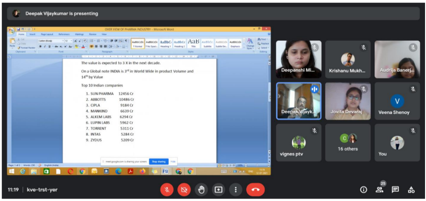 The session started at 11.15 am with a formal welcome note by prof. Veena Shenoy and Ms. Deepanshi gave the formal introduction of the guest speaker who then took over the session. The session started with an introduction to the market size and product information about the pharma industry. Then he showed us the top 10 pharma companies in India. Then he explained the advantages of the pharma industry in India.
