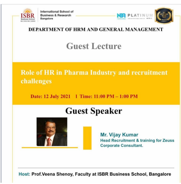 The session was very insightful. The speaker explained the recruitment and selection process in the pharma industry. Also, the challenges they are facing in that industry regarding recruitment and selection. It was a very informative and interactive session. As a whole, students found the session engaging and informative with many live organizational examples.