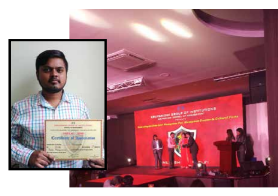 Sai Charan of PGDM batch 2017- 19 secured first place in Fuego 2018 organized by Krupanidhi College of Management in paper presentation. bHe received Rs. 3000 cash prize with a trophy and certificate of appreciation.