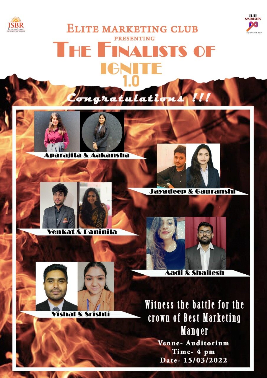 Brief Introduction: Elite Marketers, Marketing Club of ISBR organized IGNITE 1.O , an event in the quest of best marketing Management team and the best Manager. It was a 4 days marketing event, with full of excitement and challenges. A roller coaster event for the participants. The event starts with Maiz and followed by Beat around the bush, Turncoat, Ignite To SMASH, Innovation 360, and ends with Marketing Maestro. Participants showed us great
