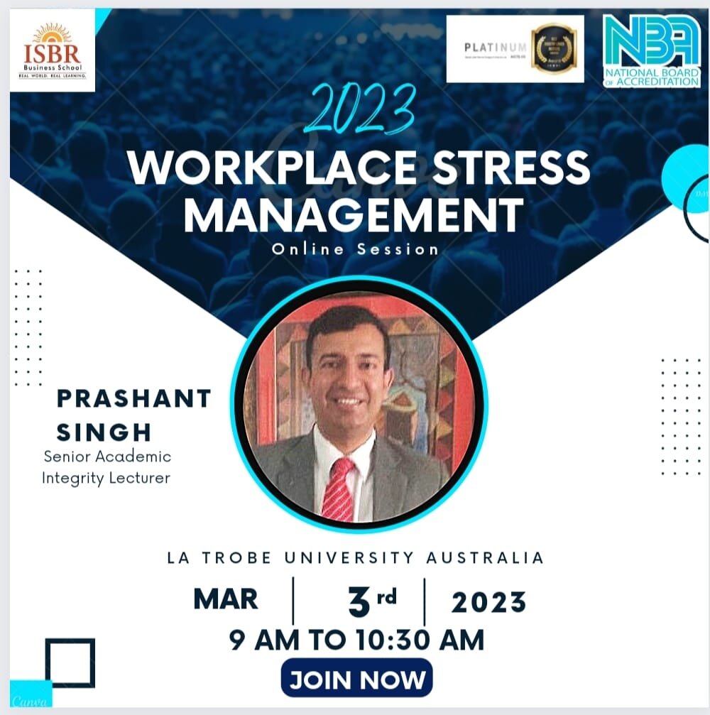 Abstract/Snapshot: Internationl office, ISBR, under the leardership of Ms. Supriya Lamba Sahdev, organized a special guest lecture by area expert Mr. Prashant Singh on – “Workplace Stress Management” for the PGDM students of batch 2022-24.
