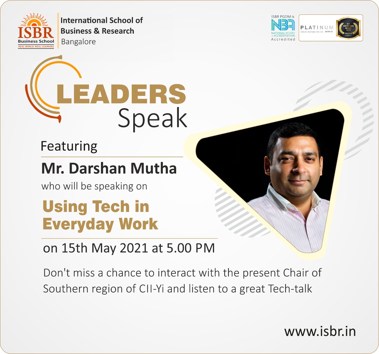 Leadership Series is a platform where you get to interact with the modern-day leaders of the business world. Any entrepreneur running his business, sustaining it, and scaling up his business operations within a remarkable frame of time is noted as a successful leader in his/her field. The first session of ‘Leaders Talk’ was one such remarkable Event-an Online Series that started with a commendable mark, being a part of the assignments given to the PGDM executive batch. It was moderated by Kavita Kothari, a student of the PGDM executive batch on 15th May 2021 on Saturday at 5 pm. ‘Leaders Talk’ got its opening with the knowledgeable interactive session by Mr. Darshan Mutha, with the students of PGDM executive Batch 2021. Darshan Mutha is currently heading the chair of CII-Yi, Southern Region Karnataka. ISBR is extremely honored to have had Mr. Darshan Mutha as the guest speaker on the leader’s talk series. This session started with the welcome note by Kavita Kothari and a prayer of gratitude for healing the present world during the time of the COVID-19 Crisis. Unlike the regular and normal guest lecture wherein guests impart his/her part of knowledge about a specific topic, guests in the leader’s talk prefer to have interactive sessions with the audience.
